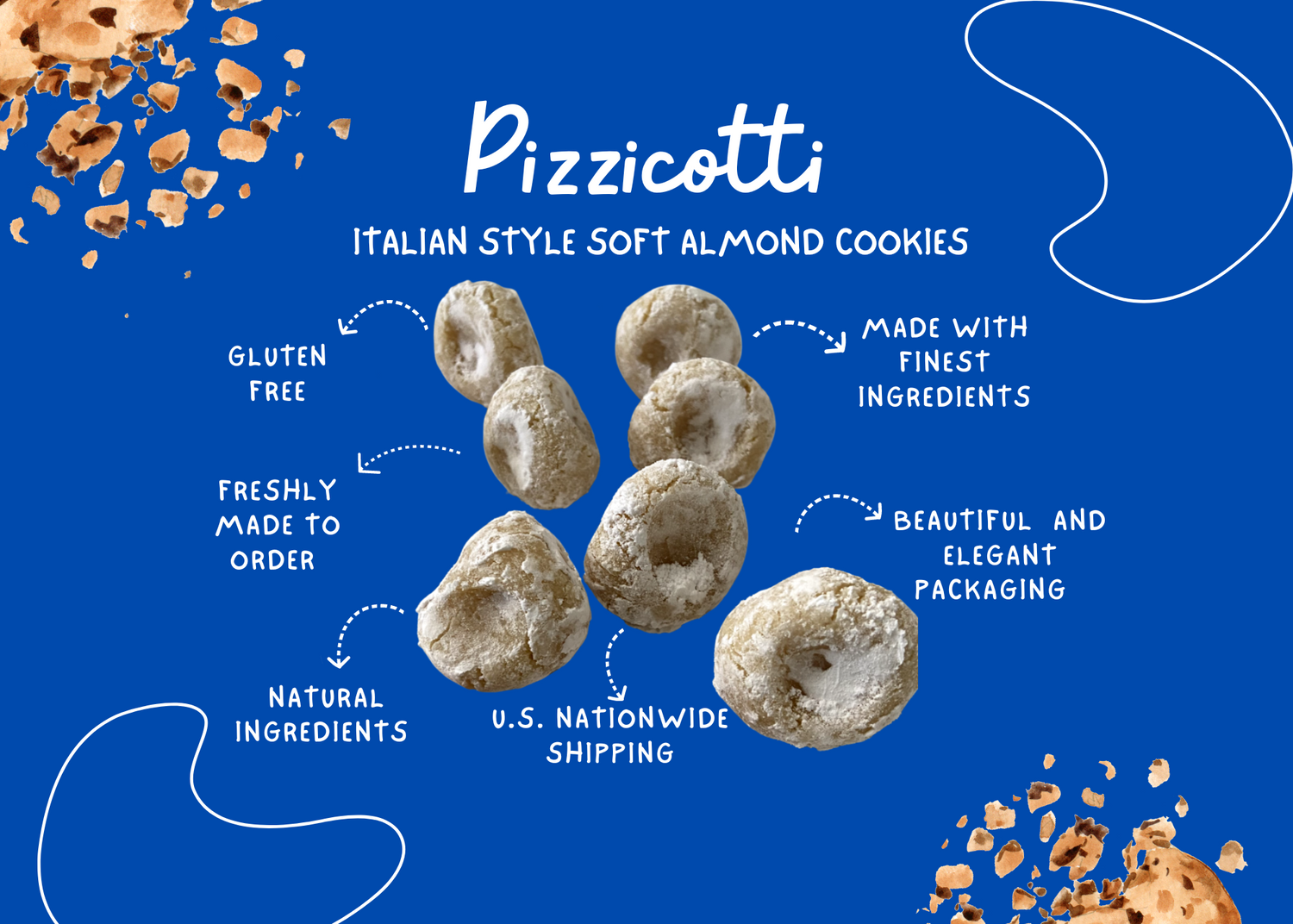 Pizzicotti, which translates to “small pinch”, are beloved gluten free and lactose free soft almond cookies originally from the regions of Southern Italy. The softness of these cookies comes from the quality of the ingredients and the love that is put into them.